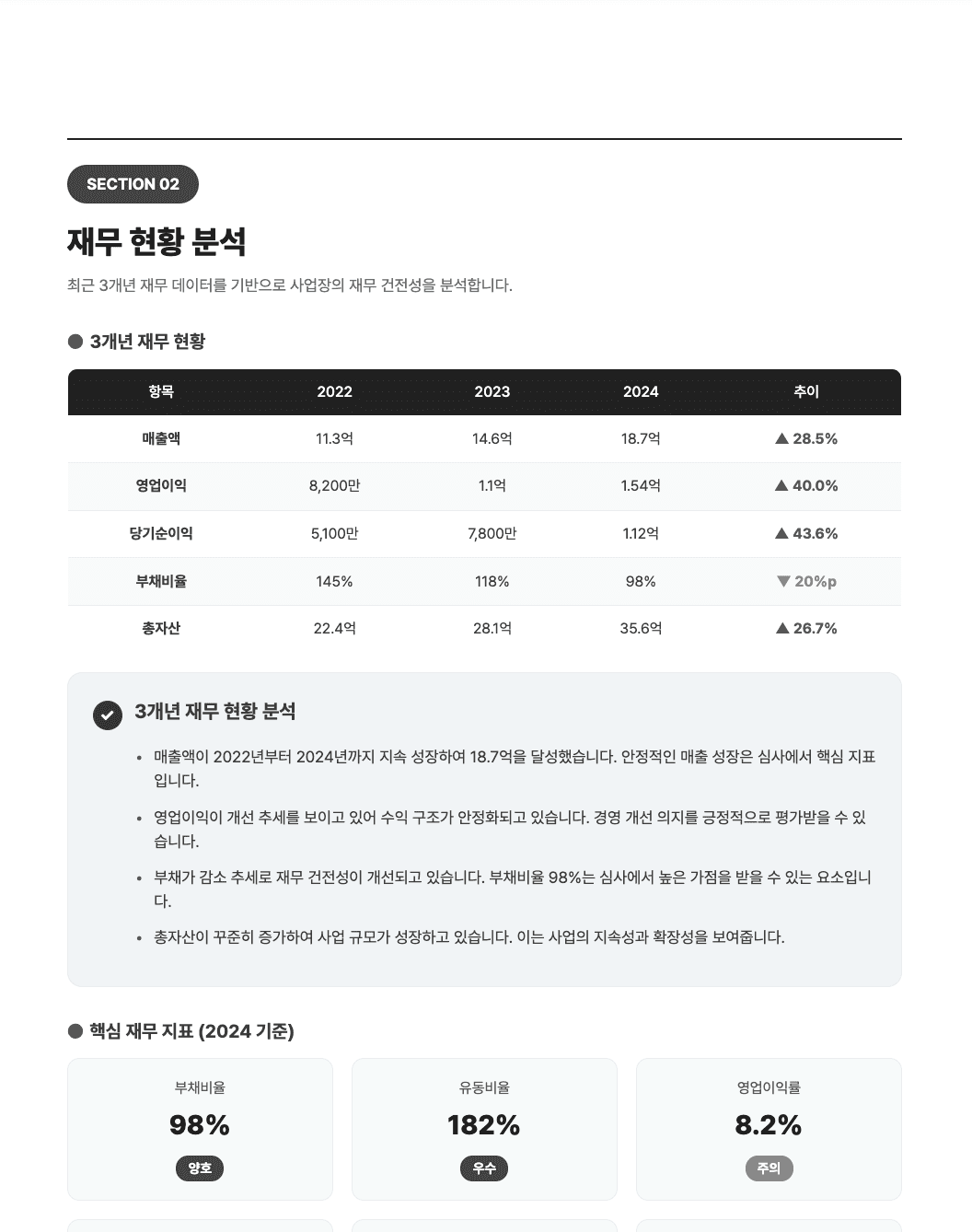 주요 재무 지표를 통해 정책자금 심사 관점의 평가 기준을 제공