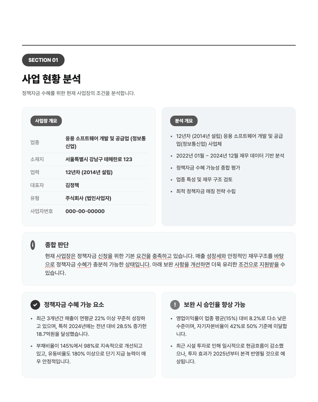 사업 현황부터 재무 분석까지 정책자금 수혜에 필요한 모든 내용을