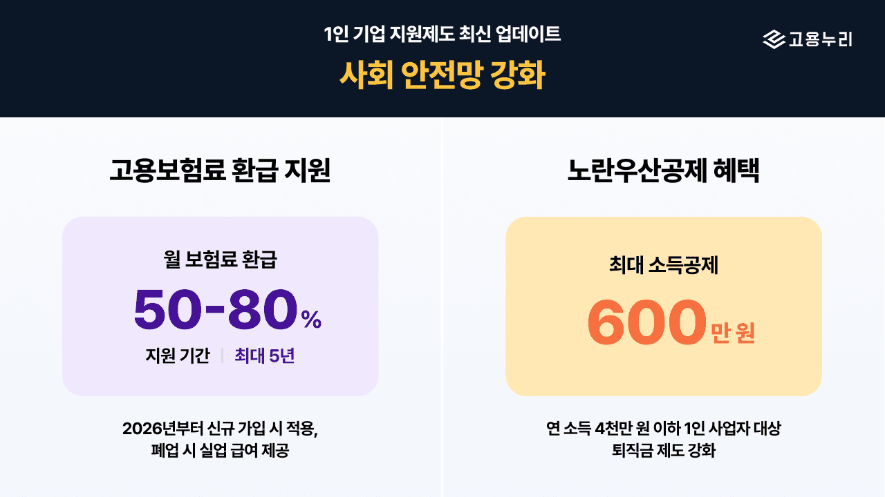 자영업자 고용보험료 지원 확대: 2026년부터 소상공인 자영업자 고용보험 가입 시 월 보험료의 50%~최대 80%를 5년 간 환급 지원하며, 폐업 시 실업급여 등을 제공합니다.