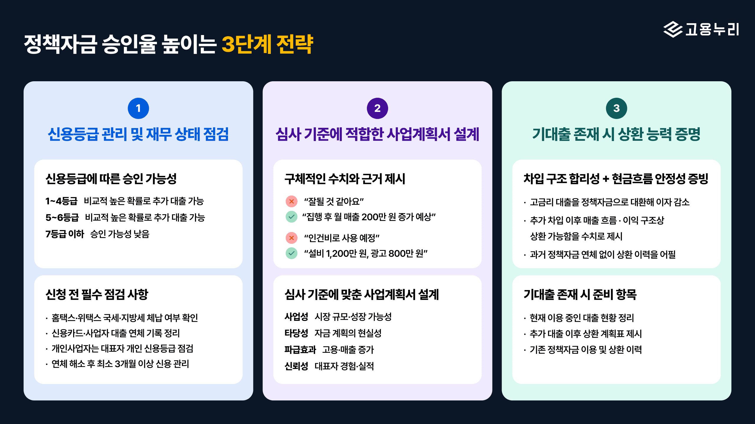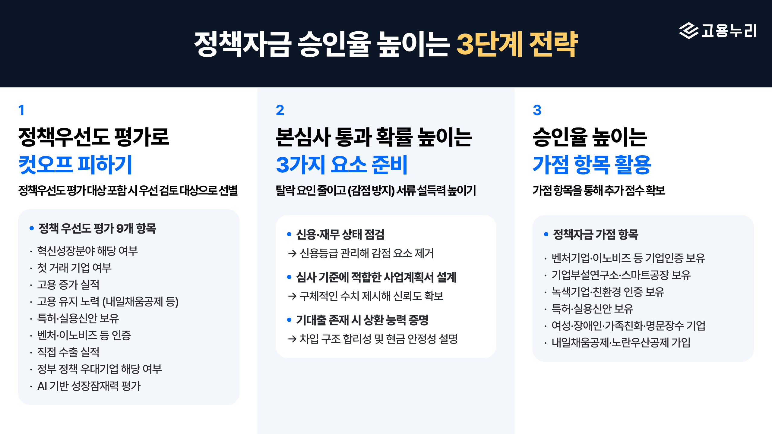 오늘은 정책자금 지원을 고민하는 대표님들을 위해 고용누리가 정책자금 승인율을 높이는 3단계 전략을 총정리 해드릴게요.
