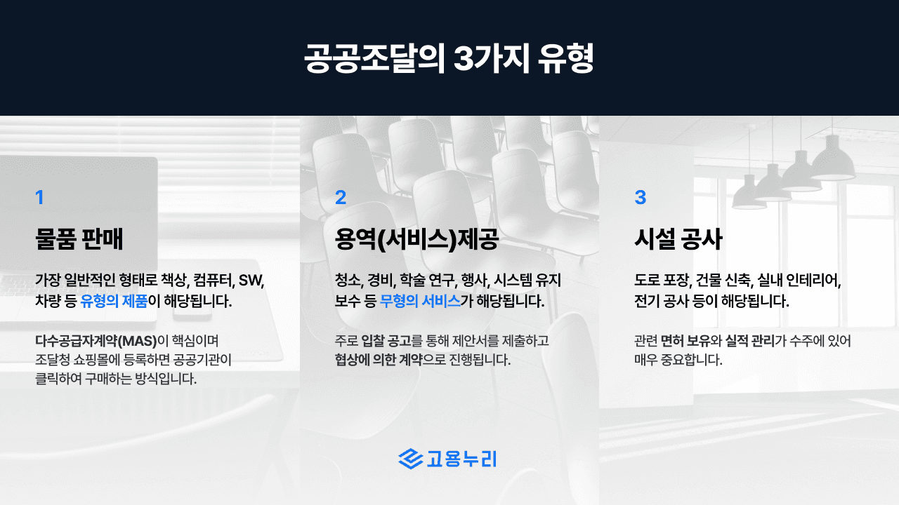 물품, 용역, 시설 공사 등 우리 기업에 맞는 조달 유형 찾기